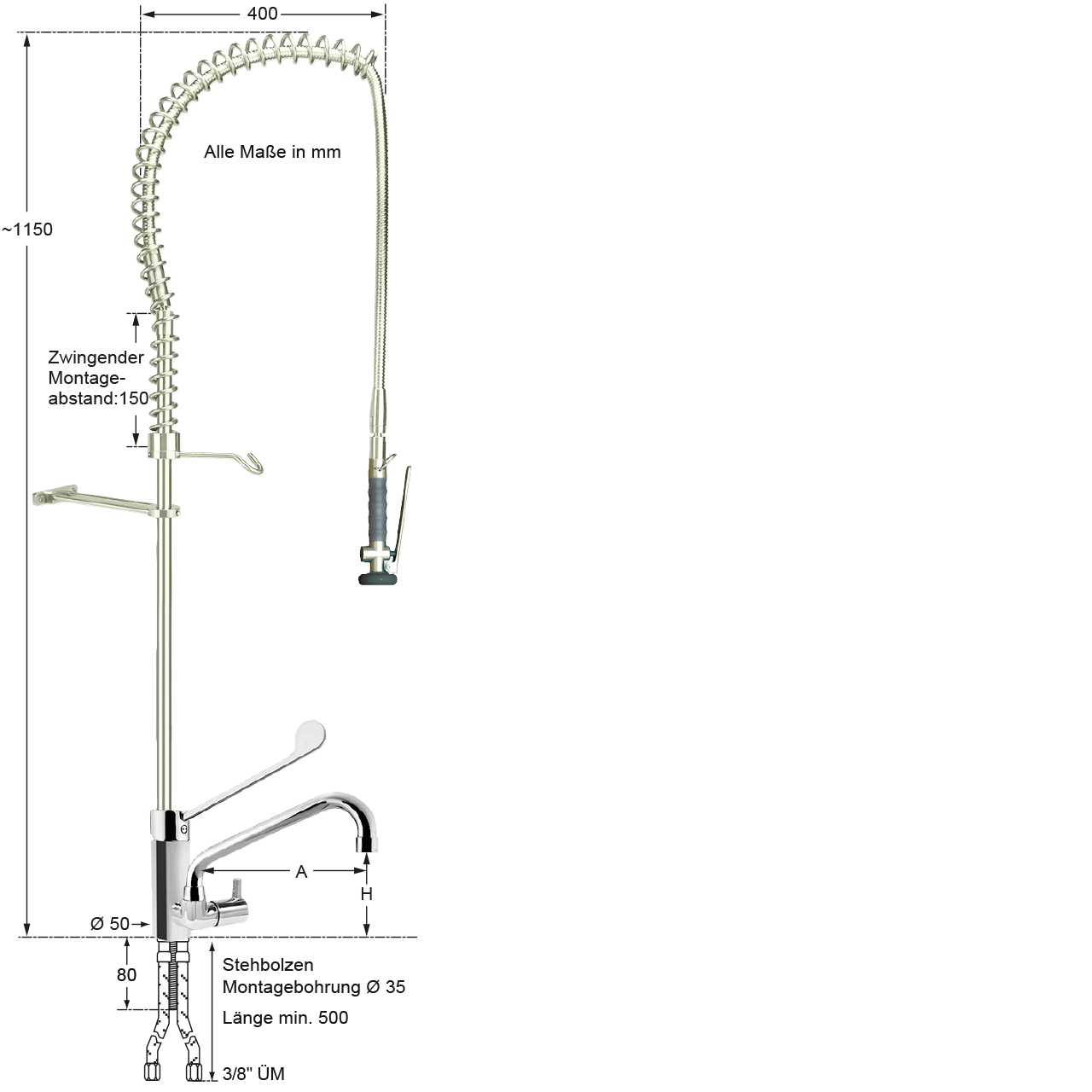 - Auslauf, Standrohr, Standrohrhalter, Brauseeinhängehaken, Federhalter, Tragfeder, Gelenkadapter komplett aus poliertem Edelstahl