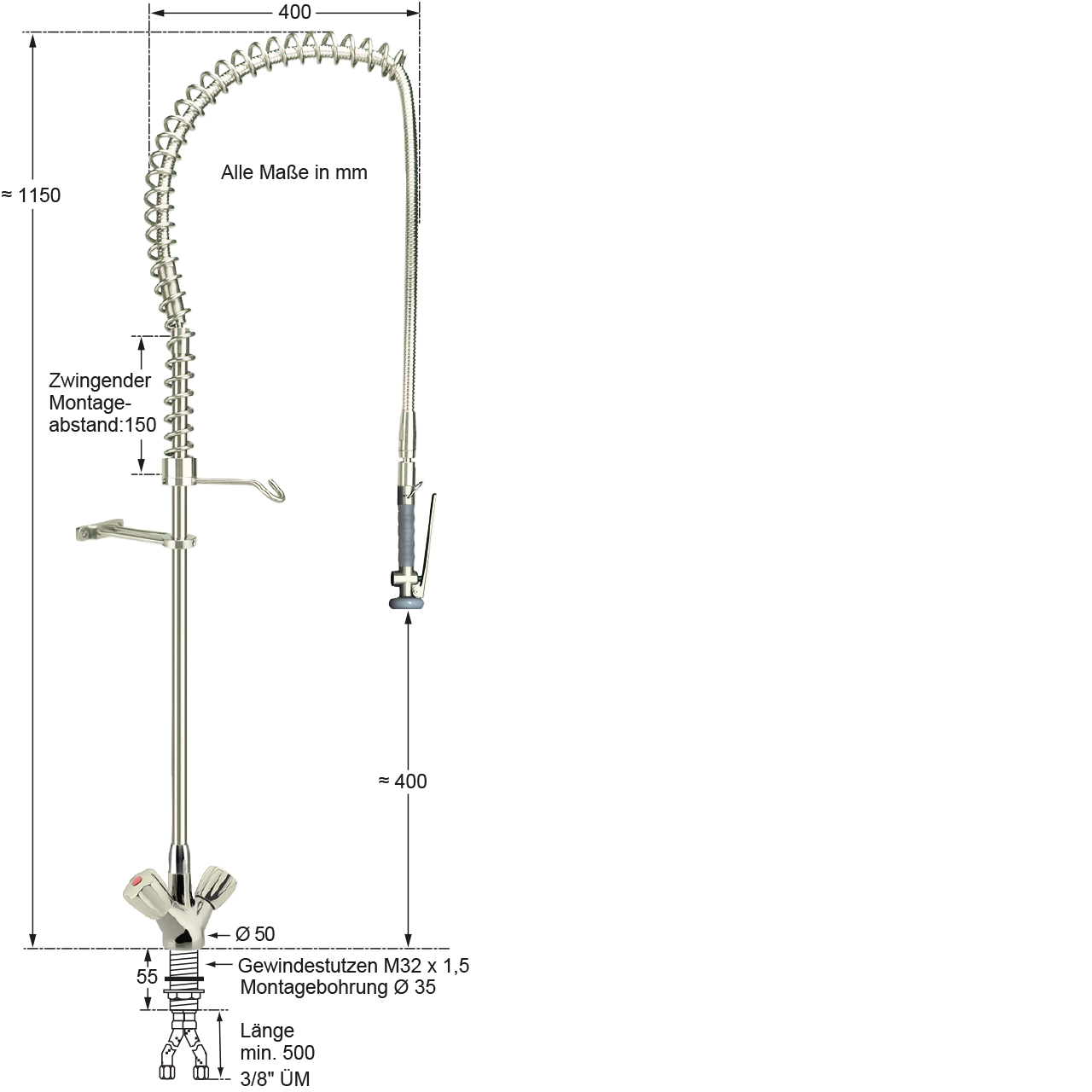- Armaturenkörper, Dreikantgriffe, Standrohr, Standrohrhalter, Brauseeinhängehaken, Federhalter, Tragfeder, Gelenkadapter und Brause komplett aus poliertem Edelstahl