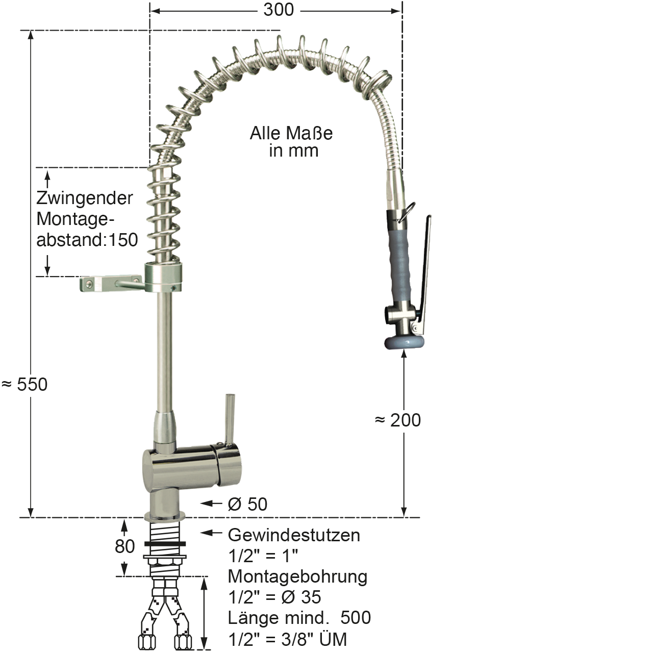 - Armaturenkörper, Hebel, Standrohr, Standrohrhalter, Brauseeinhängehaken, Federhalter, Tragfeder, Gelenkadapter und Brause komplett aus poliertem Edelstahl