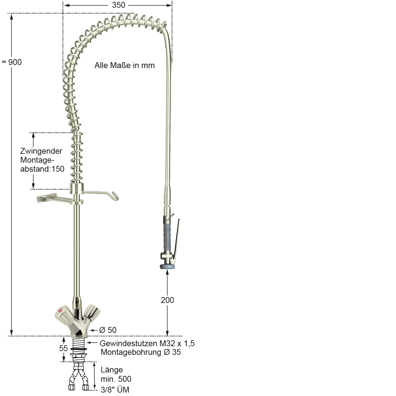 - Armaturenkörper, Standrohr, Standrohrhalter, Brauseeinhängehaken, Federhalter, Tragfeder, Gelenkadapter und Brause komplett aus poliertem Edelstahl