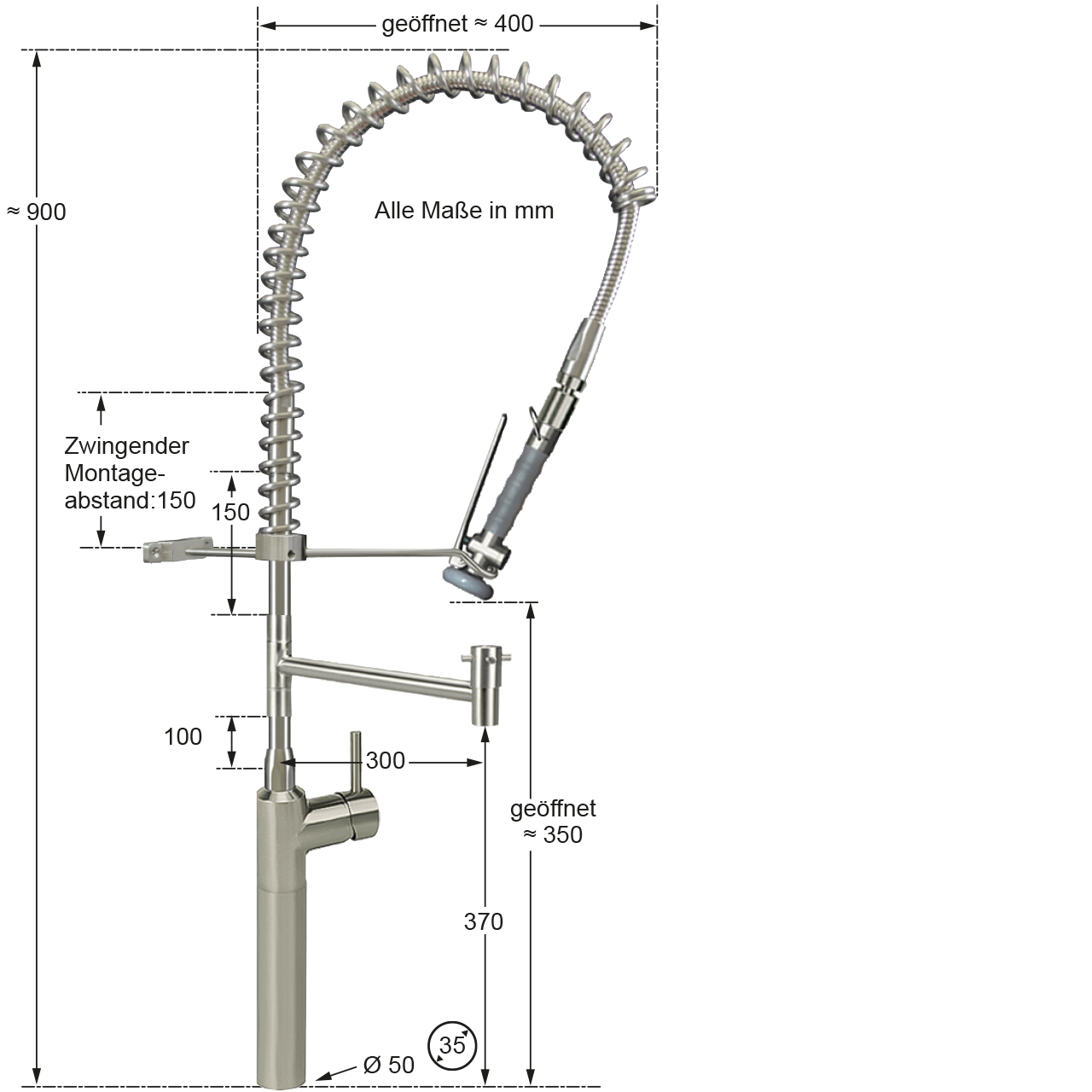 - Armaturenkörper, Hebel, Standrohr, Standrohrhalter, Brauseeinhängehaken, Federhalter, Tragfeder, Gelenkadapter und Brause komplett aus poliertem Edelstahl