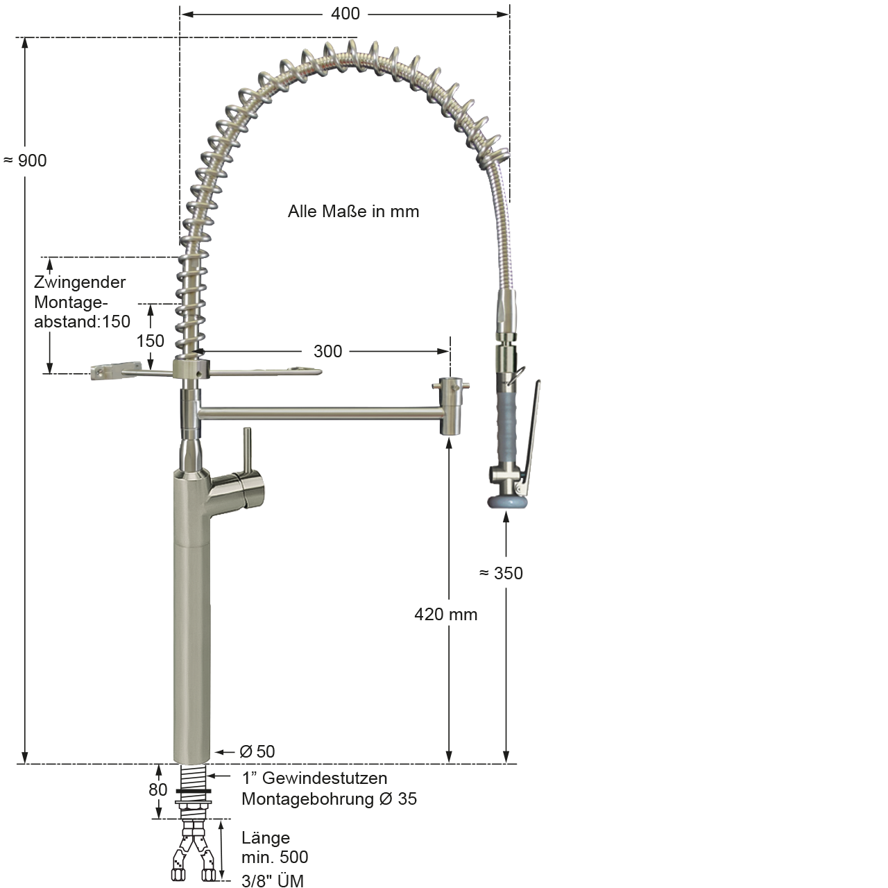 - Armaturenkörper, Standrohr, Standrohrhalter, Brauseeinhängehaken, Federhalter, Tragfeder, Gelenkadapter und Brause komplett aus poliertem Edelstahl