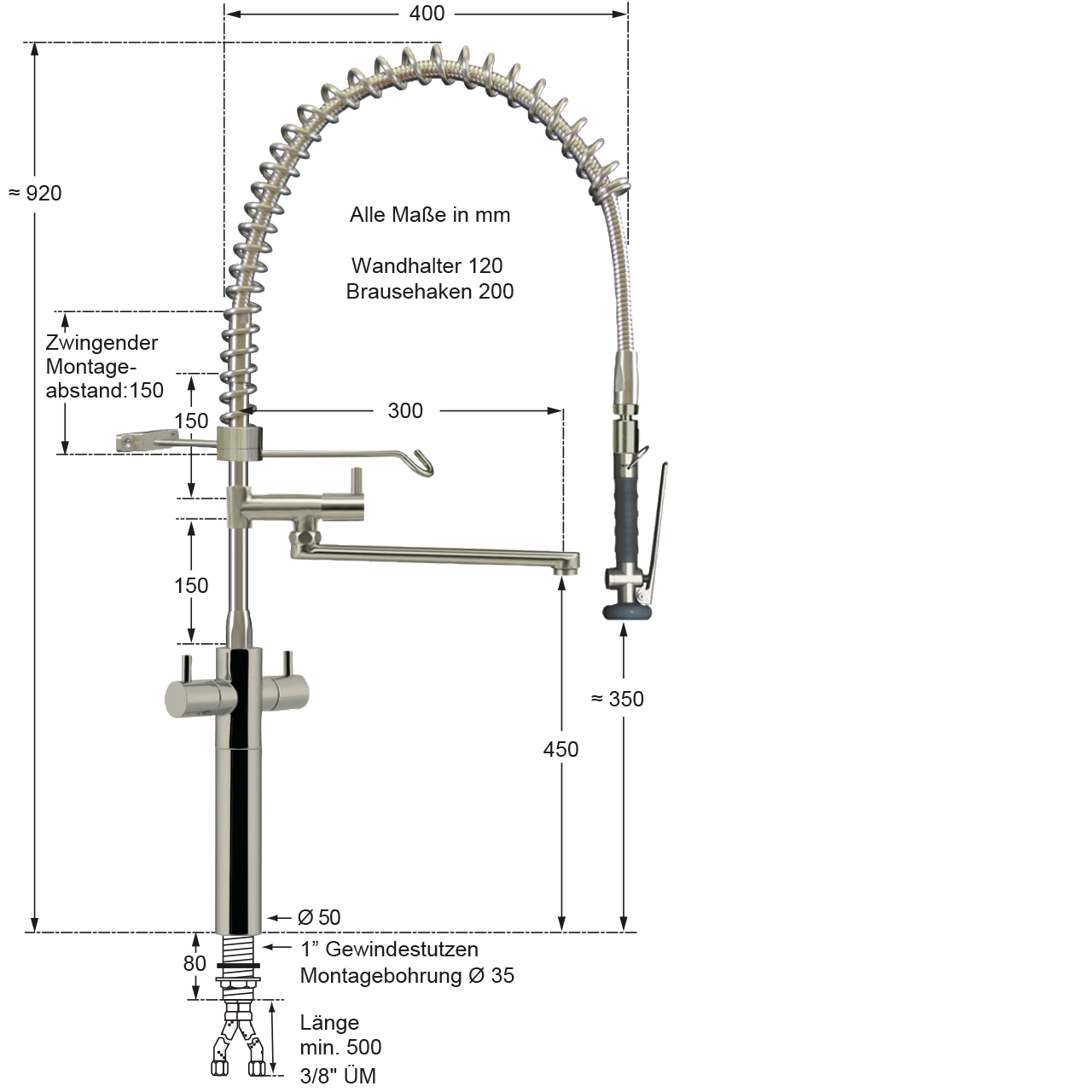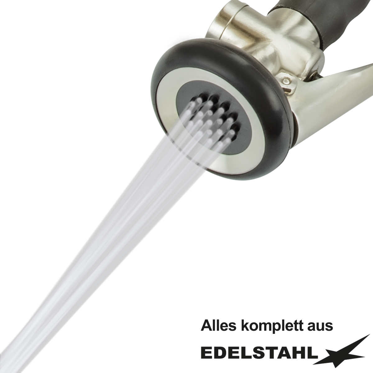 - Armaturenkörper, Hebel, Standrohr, Standrohrhalter, Brauseeinhängehaken, Federhalter, Tragfeder, Gelenkadapter und Brause komplett aus poliertem Edelstahl