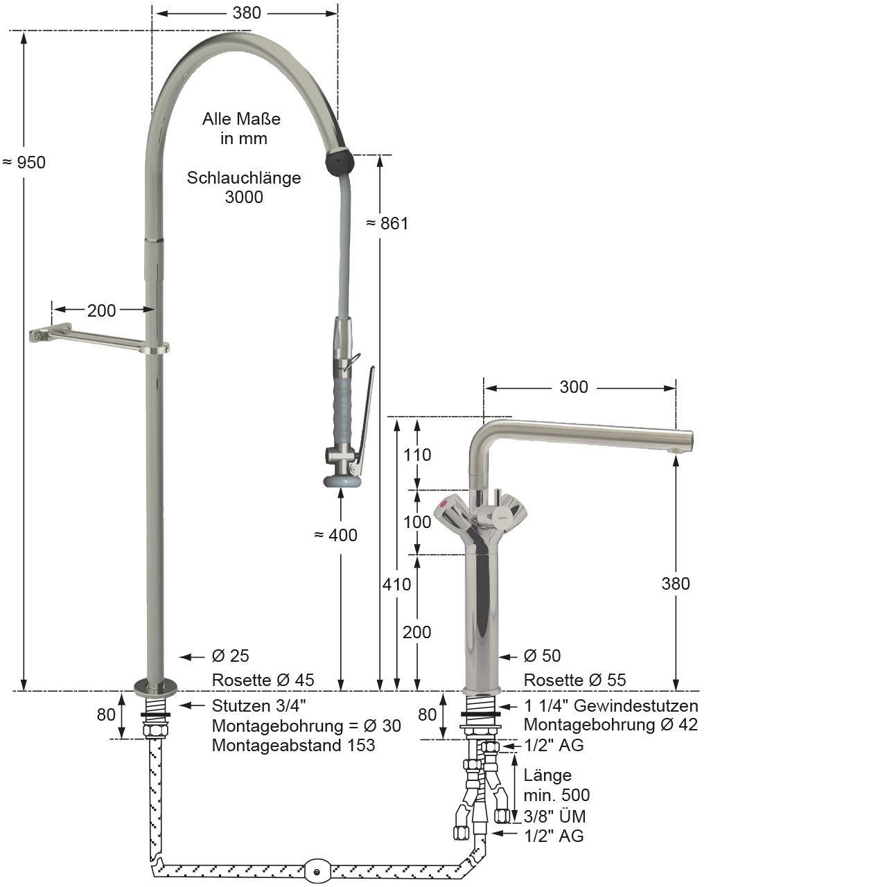 - Armaturenkörper, Kronengriffe, Standrohr, Standrohrhalter, Brauseeinhängehaken, Federhalter, Tragfeder, Gelenkadapter und Brause komplett aus poliertem Edelstahl
