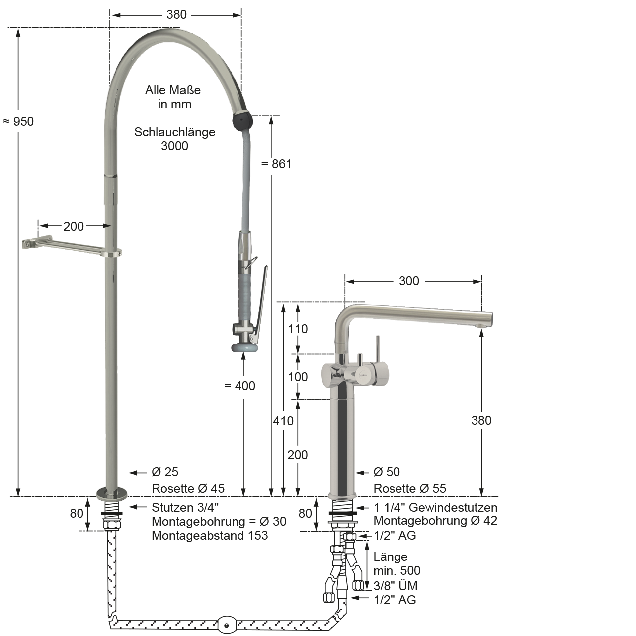 - Armaturenkörper, Hebel, Standrohr, Standrohrhalter, Brauseeinhängehaken, Federhalter, Tragfeder, Gelenkadapter und Brause komplett aus poliertem Edelstahl