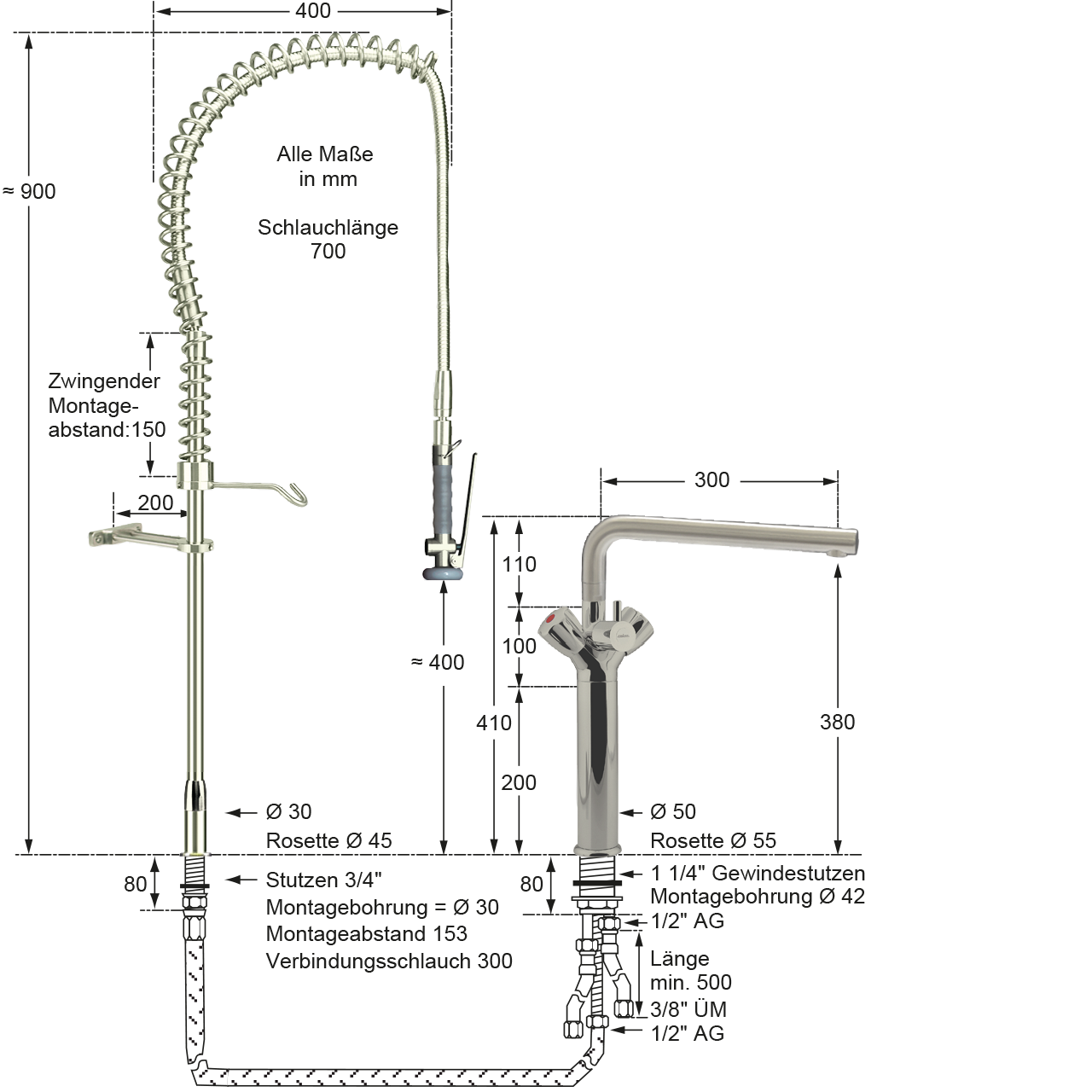 - Armaturenkörper, Kronengriffe, Standrohr, Standrohrhalter, Brauseeinhängehaken, Federhalter, Tragfeder, Gelenkadapter und Brause komplett aus poliertem Edelstahl