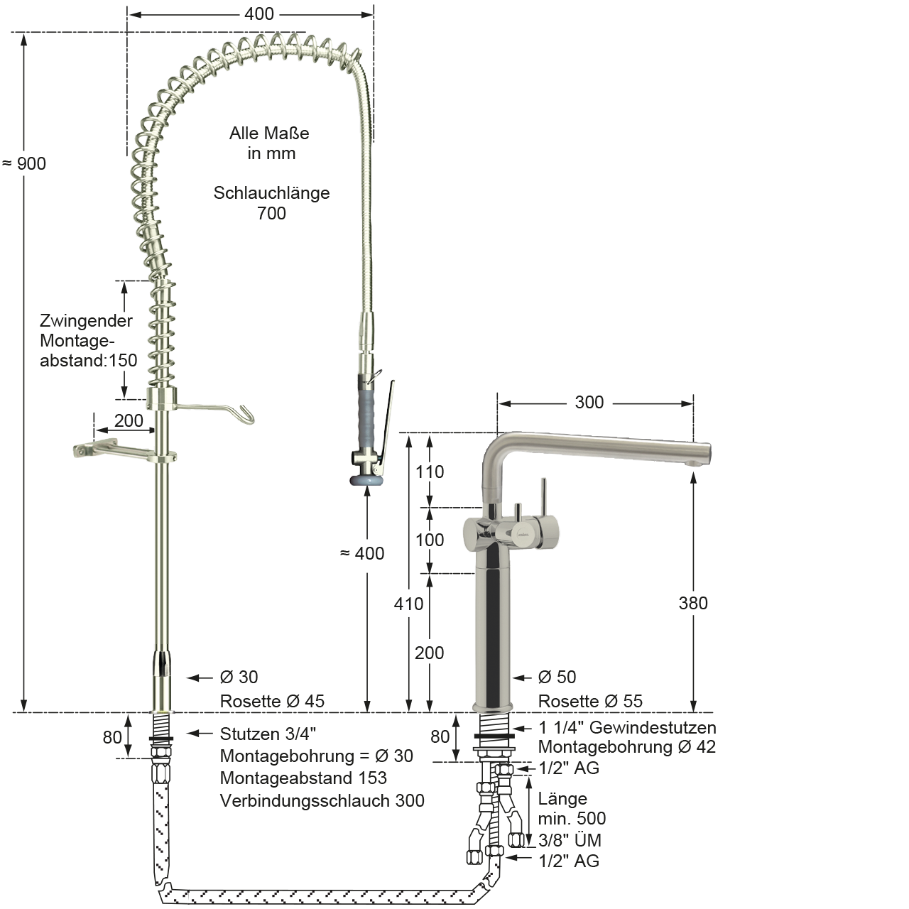- Armaturenkörper, Hebel, Standrohr, Standrohrhalter, Brauseeinhängehaken, Federhalter, Tragfeder, Gelenkadapter und Brause komplett aus poliertem Edelstahl