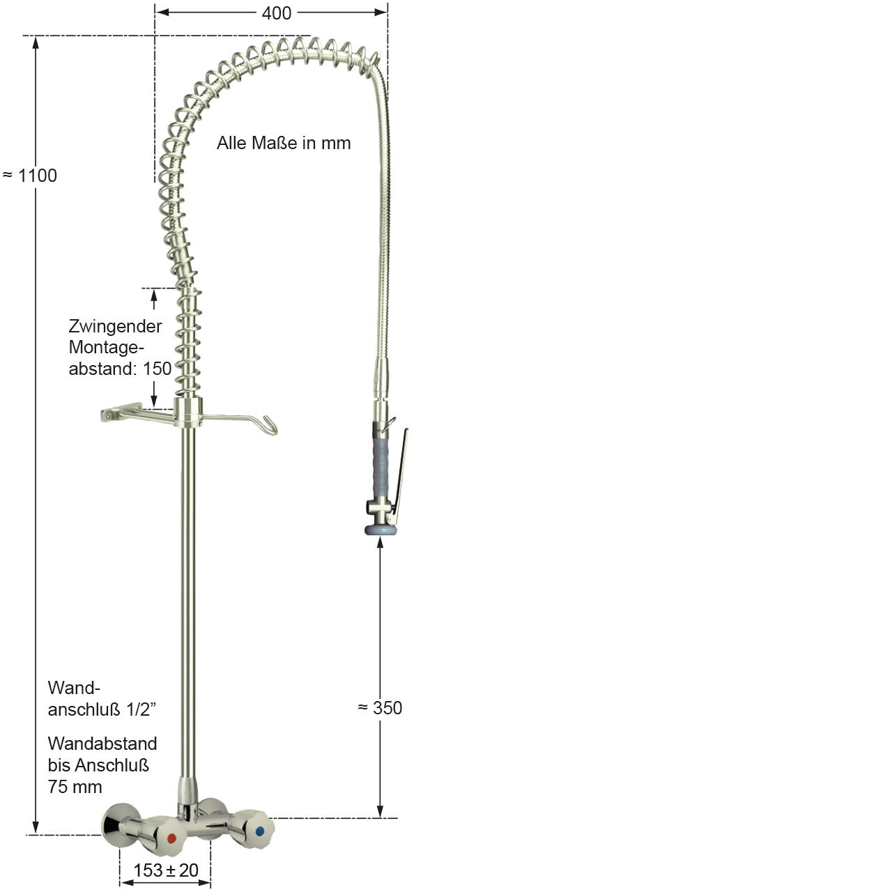 - Armaturenkörper, Dreikantgriffe, Standrohr, Standrohrhalter, Brauseeinhängehaken, Federhalter, Tragfeder, Gelenkadapter und Brause komplett aus poliertem Edelstahl
