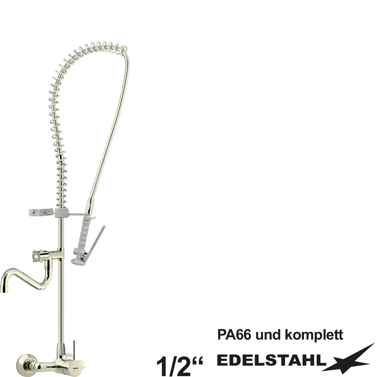 - Armaturenkörper, Hebel, Standrohr, Standrohrhalter, Brauseeinhängehaken, Federhalter, Tragfeder, Gelenkadapter und Brause komplett aus poliertem Edelstahl
