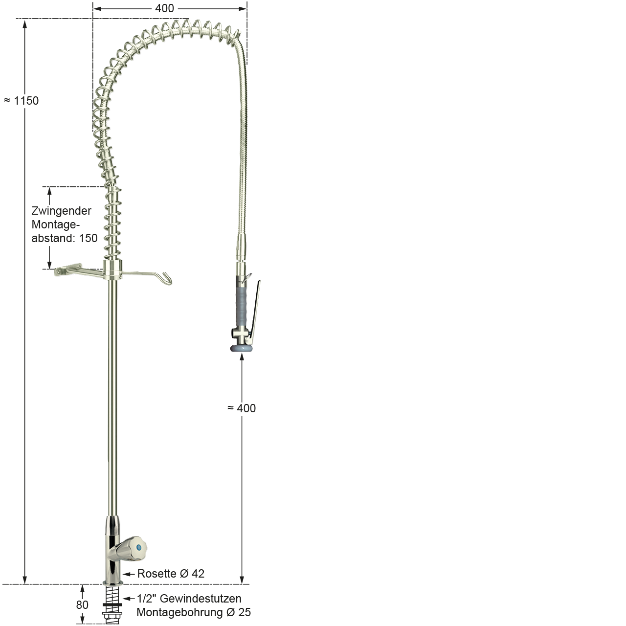 • Armaturenkörper, Dreikantgriff, Standrohr, Standrohrhalter, Brauseeinhängehaken, Federhalter, Tragfeder, Gelenkadapter und Brause komplett aus poliertem Edelstahl