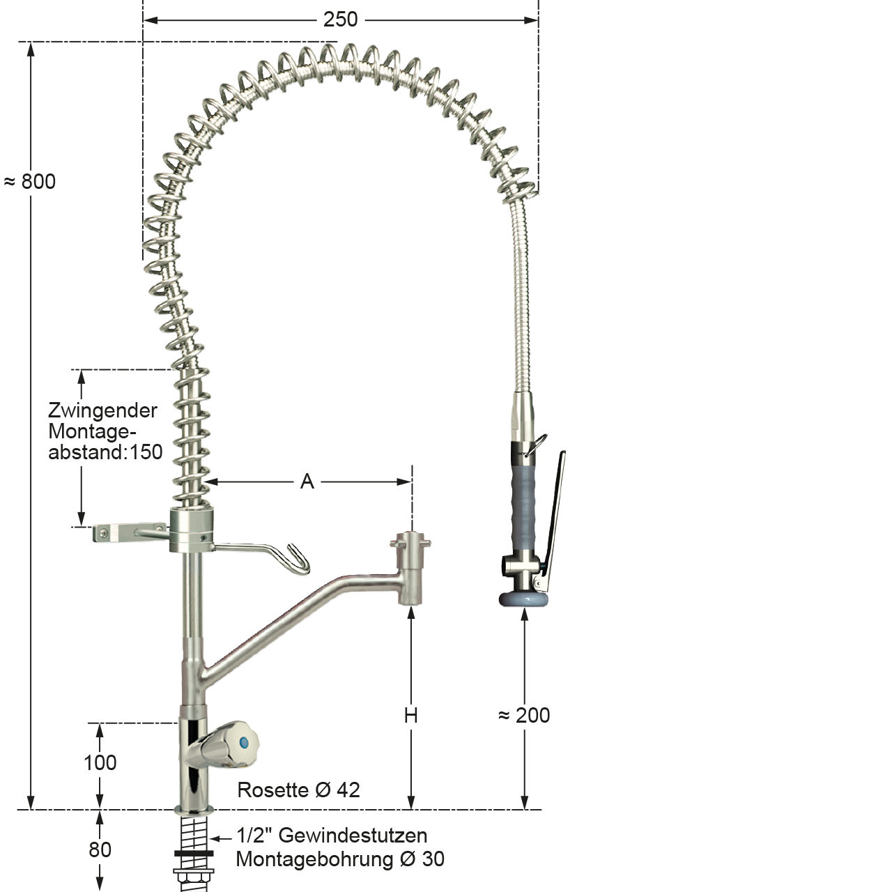 - Armaturenkörper, Dreikantgriff, Standrohr, Standrohrhalter, Brauseeinhängehaken, Federhalter, Tragfeder, Gelenkadapter und Brause komplett aus poliertem Edelstahl