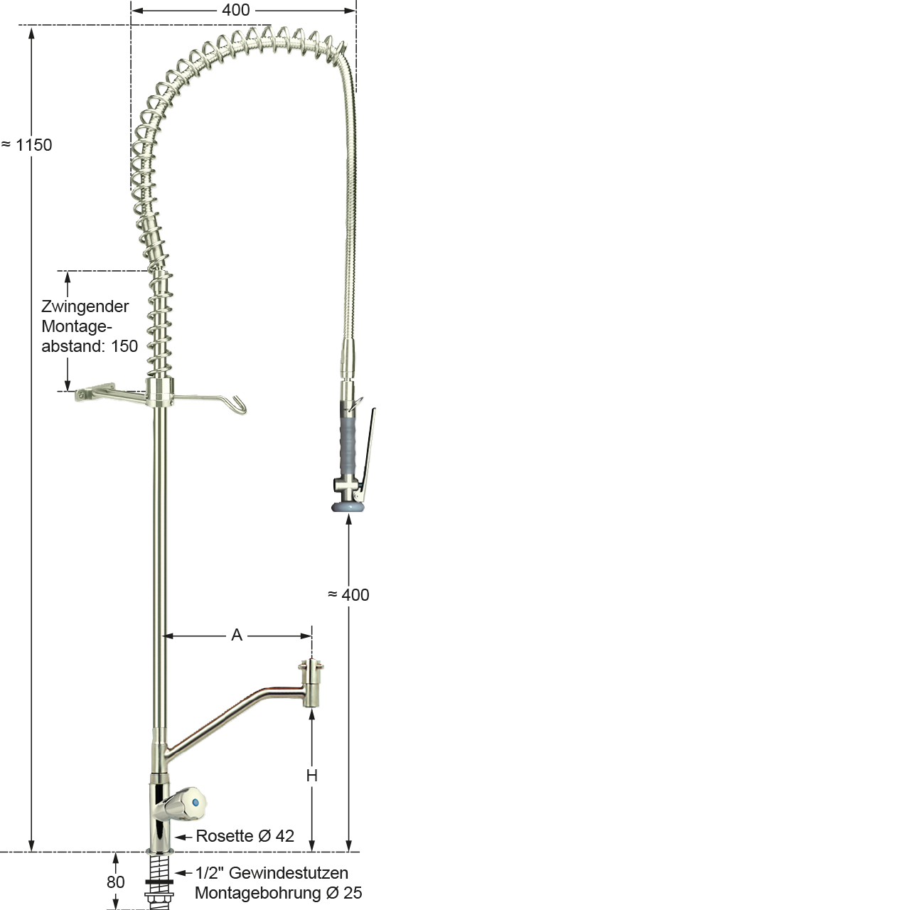 - Armaturenkörper, Hebel, Standrohr, Standrohrhalter, Brauseeinhängehaken, Federhalter, Tragfeder, Gelenkadapter und Brause komplett aus poliertem Edelstahl