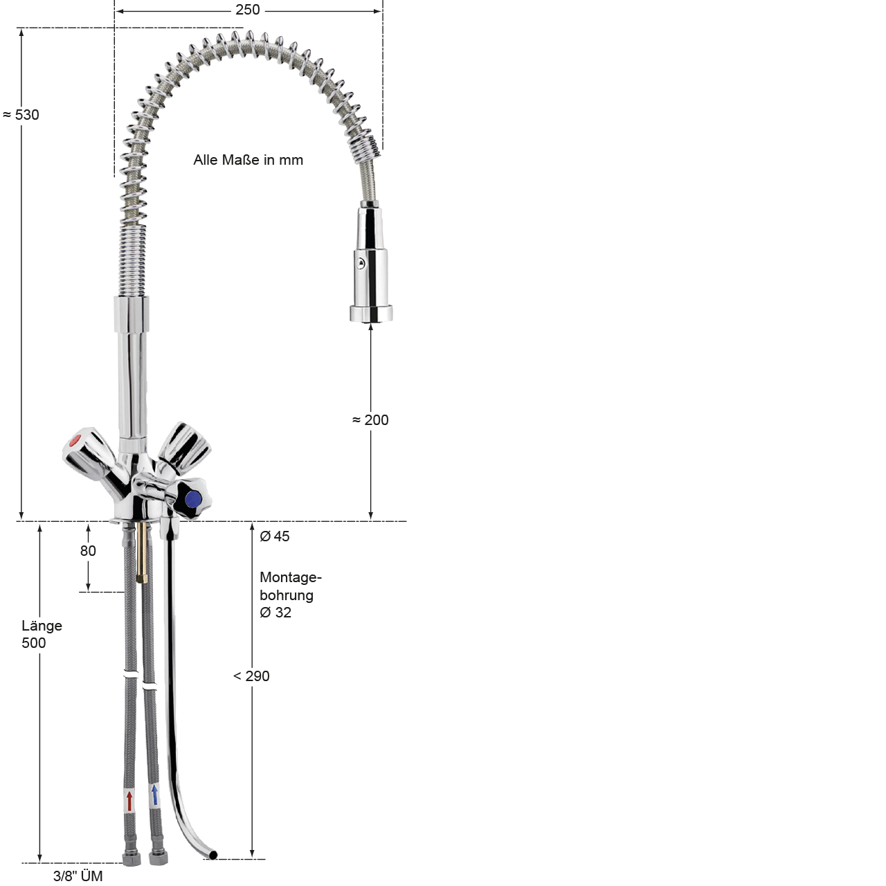 - Spültheken-Einlochbatterie 1/2" mit Standrohr, Feder, Metallschlauch und Brausehalter aus Ganzmetall verchromt