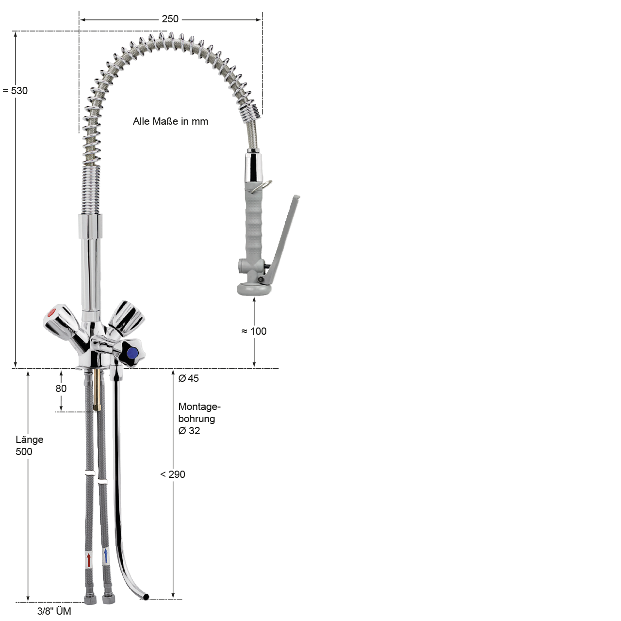 - Mit Pentachrom-Metallgriffe, Stehbolzenbefestigung flexible Anschlussschläuche