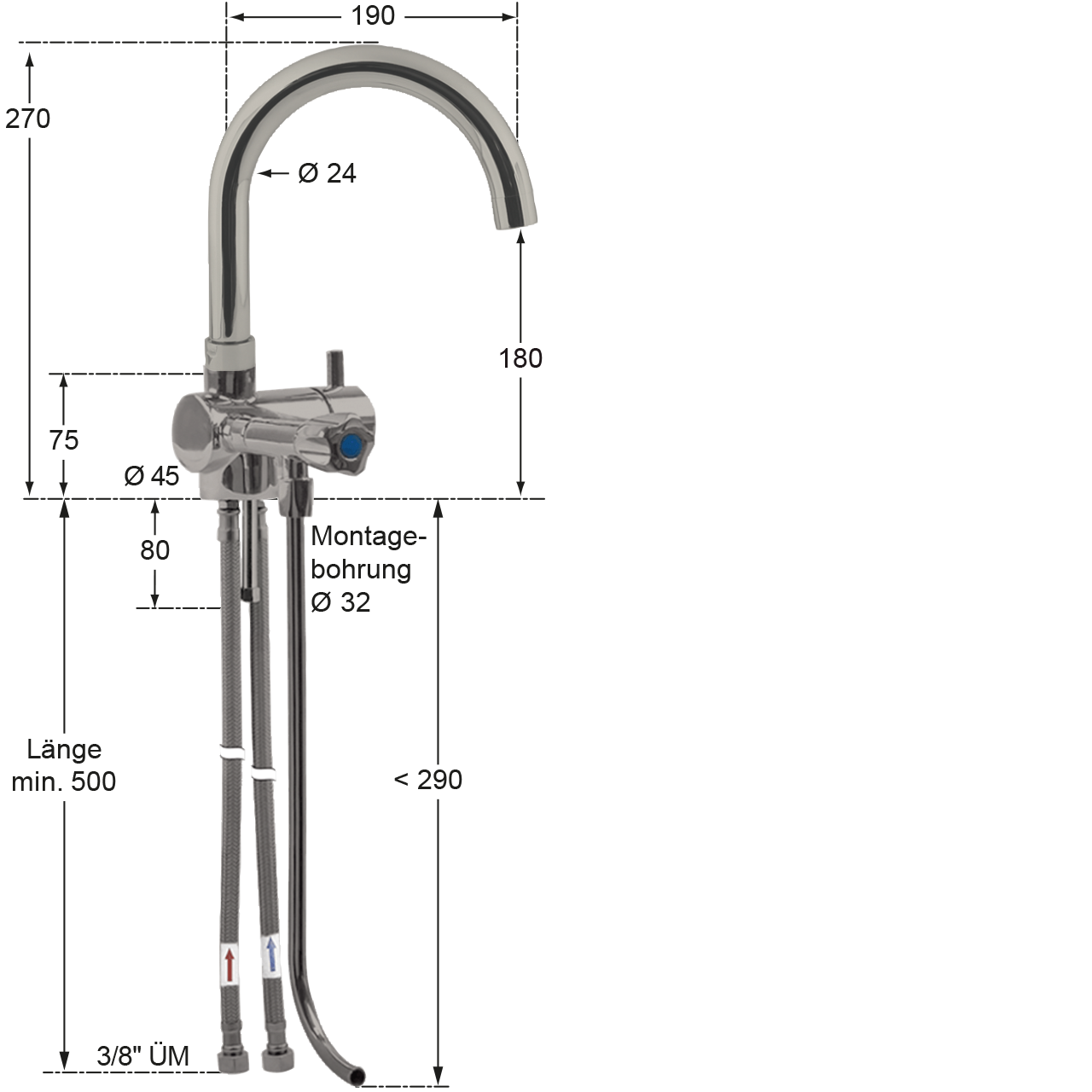 - Ventilabgang mit Fettkammeroberteil 3/8" und Unterspülrohr L < 290 mm für Kaltwasser