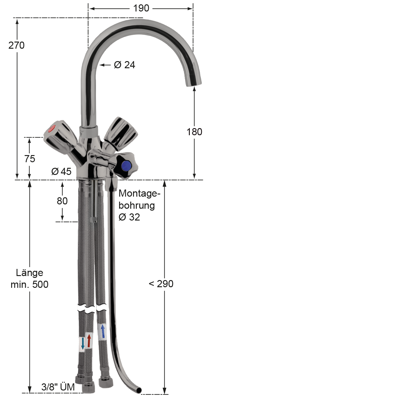 - Ventilabgang mit Fettkammeroberteil 3/8" und Unterspülrohr L < 290 mm für Kaltwasser