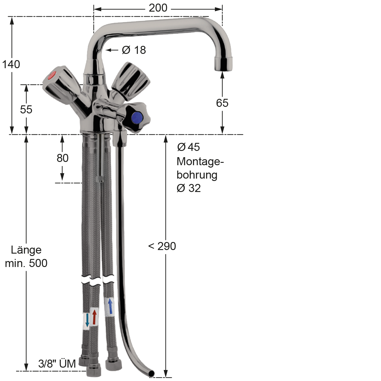 - Ventilabgang mit Fettkammeroberteil 3/8" und Unterspülrohr L < 290 mm für Kaltwasser