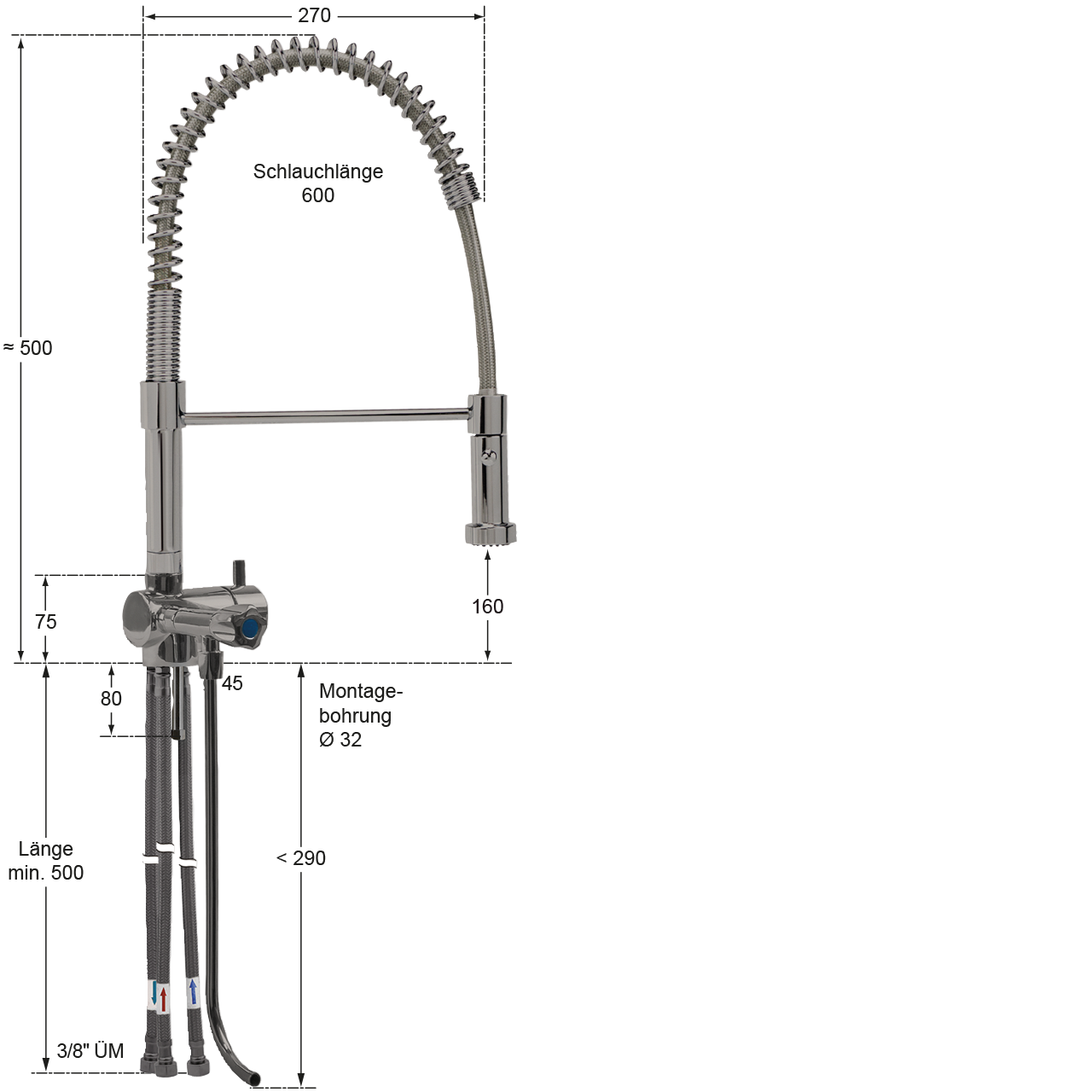 - Montagefreundliche Stehbolzenbefestigung für Tischplattenstärken bis 80 mm, Edelstahlgeflecht-Anschluss- Schläuche L 500 mit 3/8" Überwurfmutter,