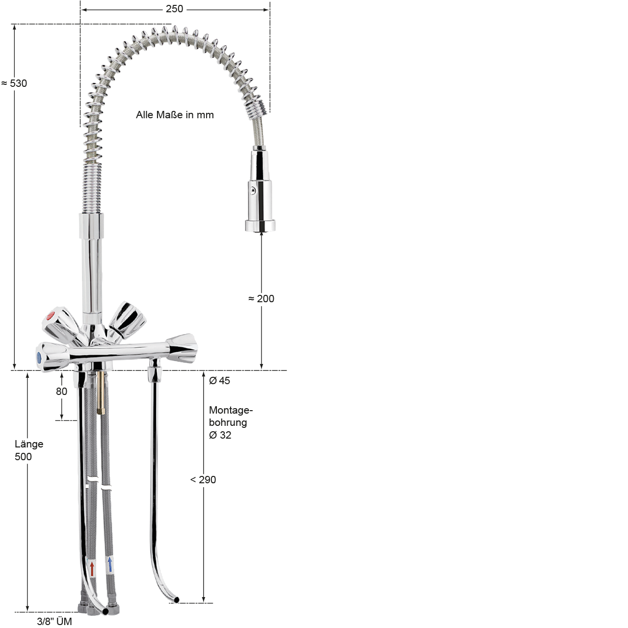 - Fettkammeroberteile und Metallgriffe, montagefreundliche Stehbolzenbefestigung für Tisch- plattenstärken bis 80 mm, Edelstahlgeflecht-Anschluss- Schläuche L 500 mmmit 3/8" Überwurfmutter,