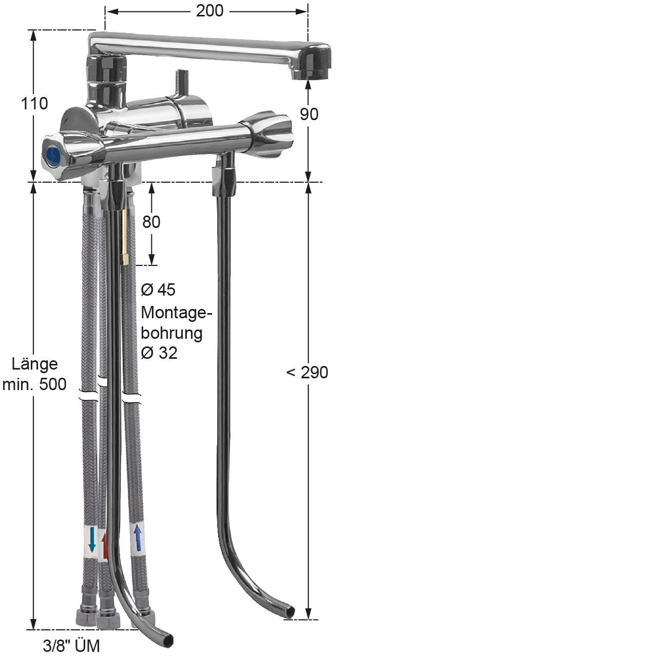 - Ventilabgang mit Fettkammeroberteil 3/8" und Unterspülrohr L < 290 mm für Kaltwasser