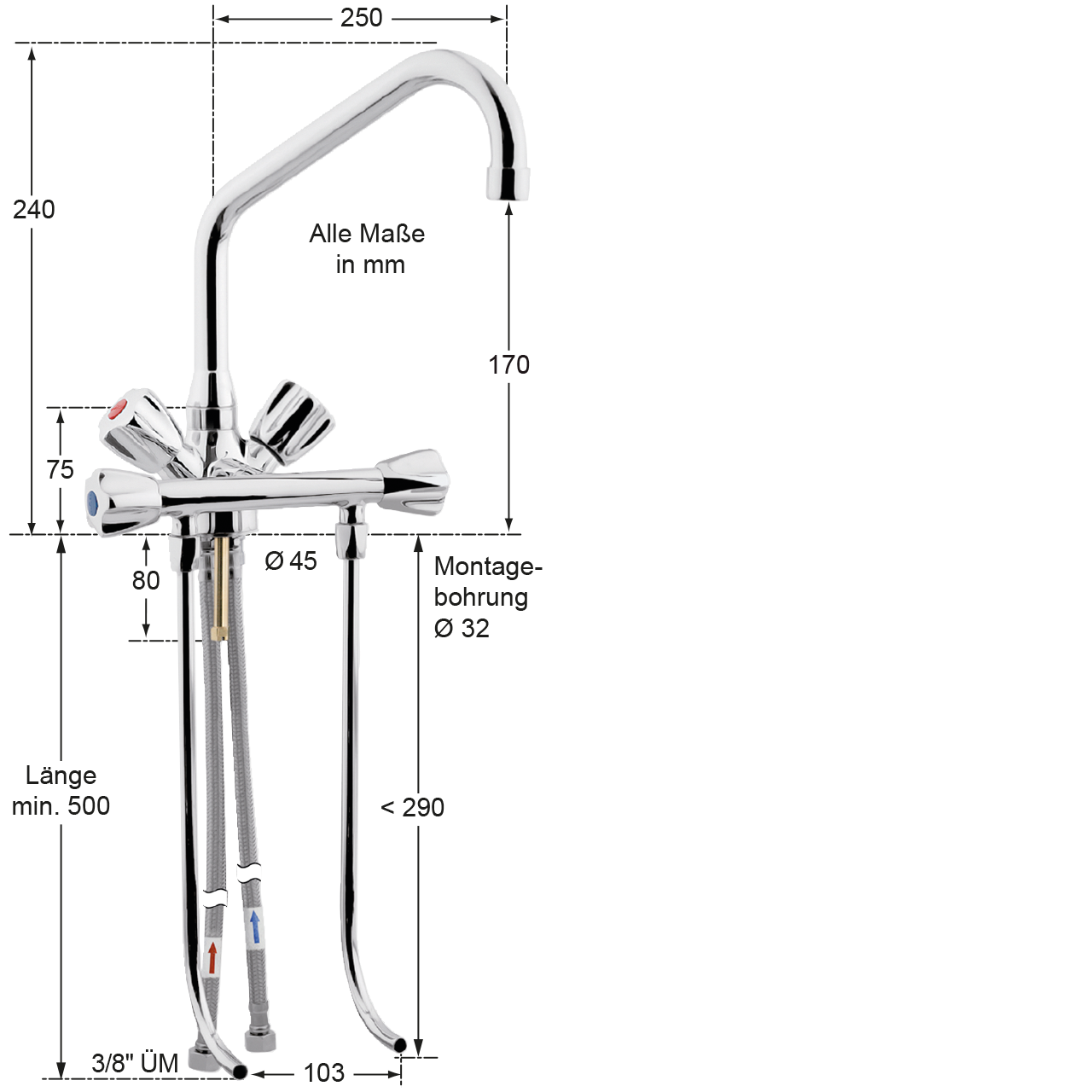 - 2 Ventilabgänge mit Fettkammeroberteil 3/8" und Unterspülrohren L < 290 mm für Kaltwasser