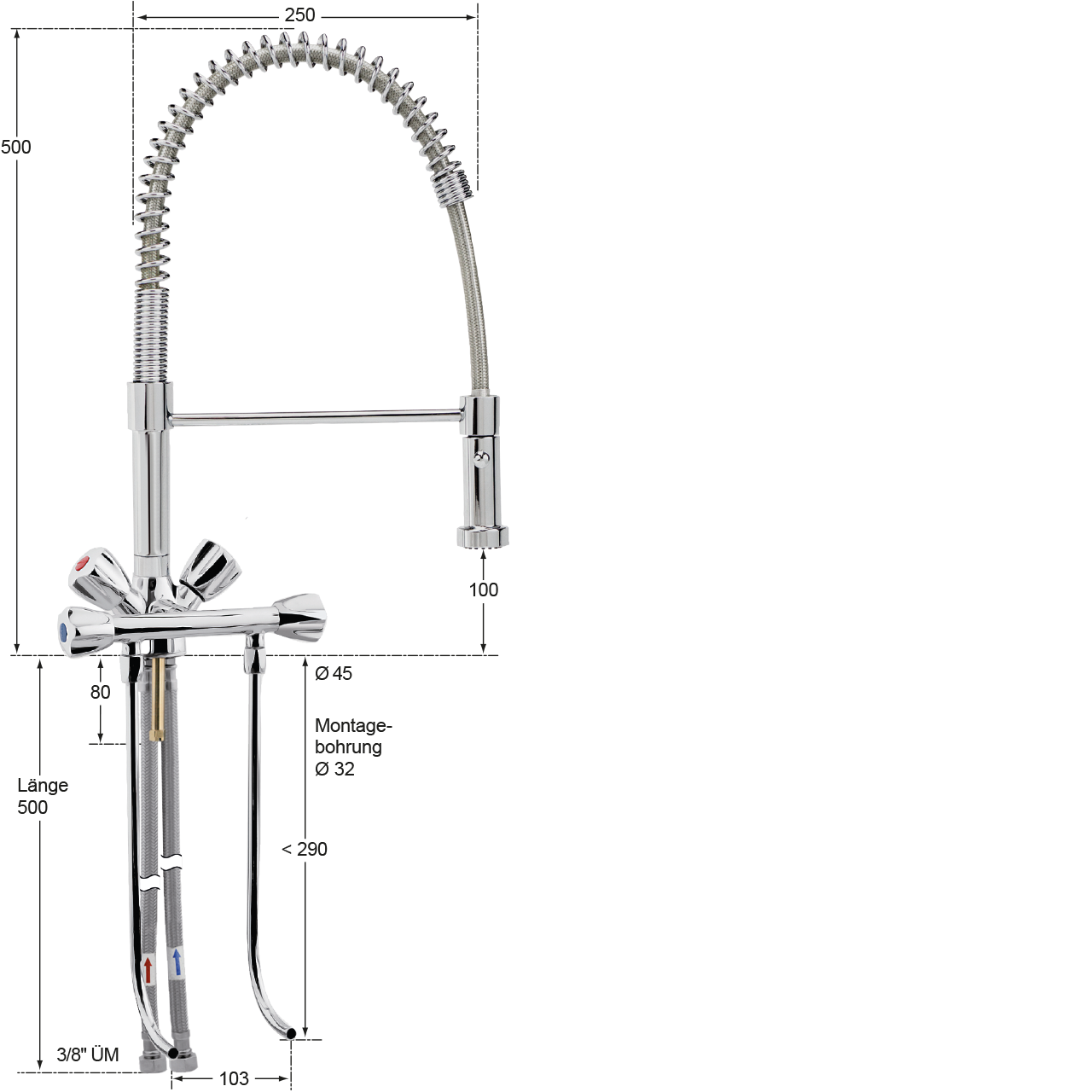 - Spültheken-Einlochbatterie 1/2" mit Standrohr, Feder, Metallschlauch und Brausehalter aus Ganzmetall verchromt