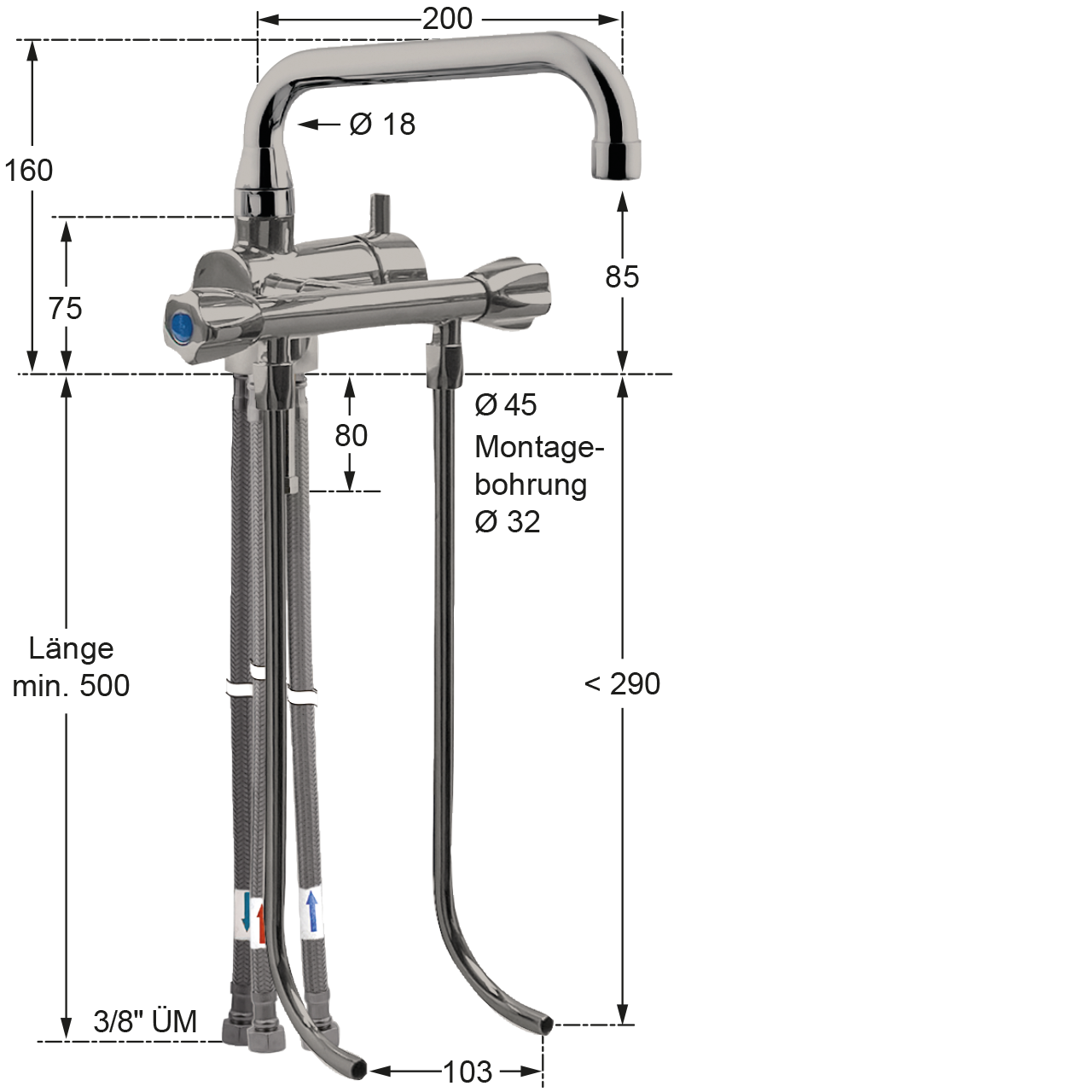 - Ventilabgang mit Fettkammeroberteil 3/8" und Unterspülrohr L < 290 mm für Kaltwasser