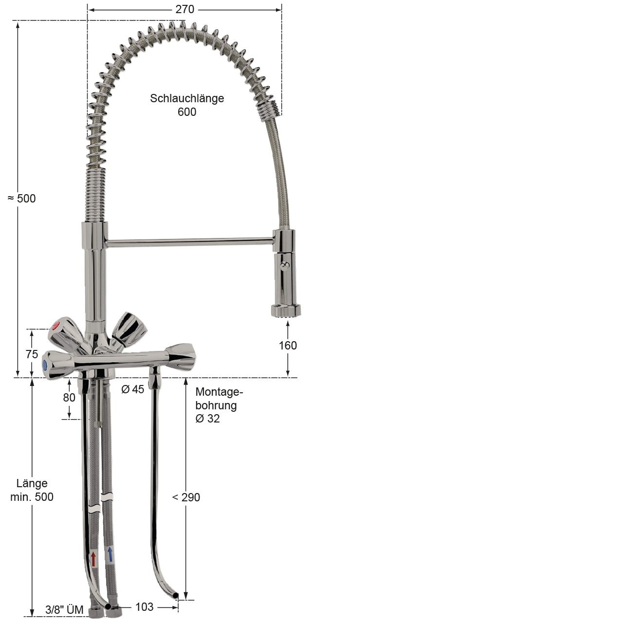 - Spültheken-Einlochbatterie 1/2" mit Standrohr, Feder, Metallschlauch und Brausehalter aus Ganzmetall verchromt