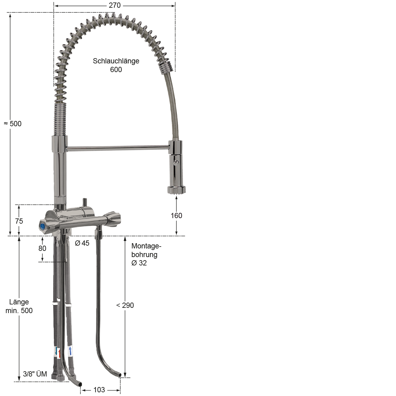 - Montagefreundliche Stehbolzenbefestigung für Tischplattenstärken bis 80 mm, Edelstahlgeflecht-Anschluss- Schläuche L 500 mit 3/8" Überwurfmutter,
