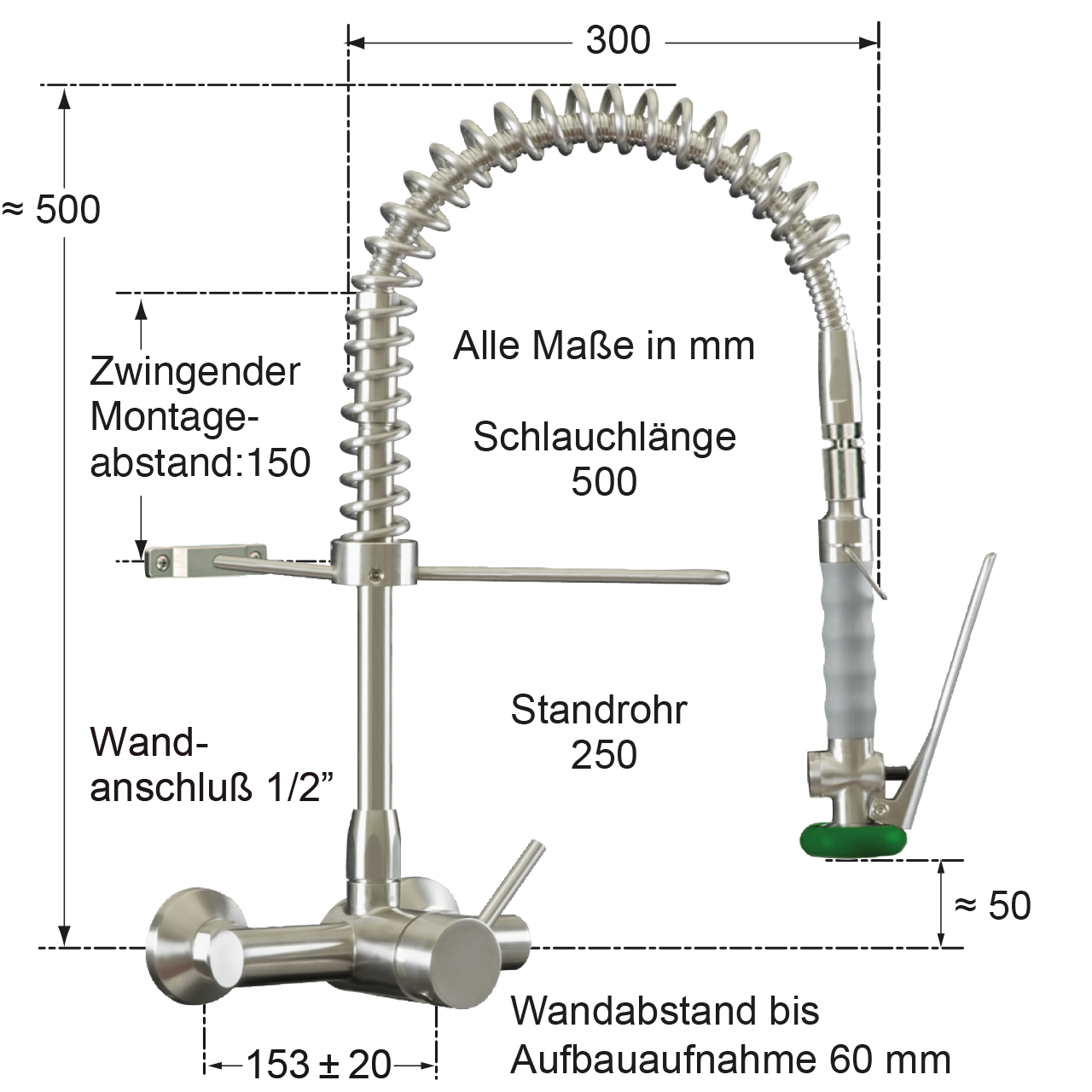- Armaturenkörper, Hebel, Standrohr, Standrohrhalter, Brauseeinhängehaken, Federhalter, Tragfeder und Gelenkadapter komplett aus poliertem Edelstahl
