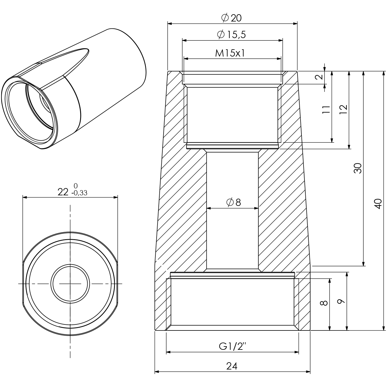 Gewindenippel 1/2" IG x M15x1 IG. SW24 mm außen